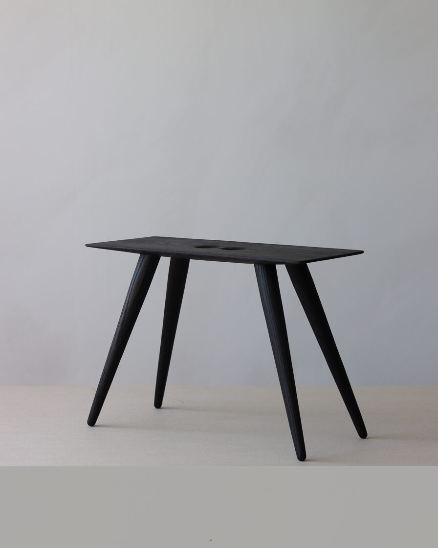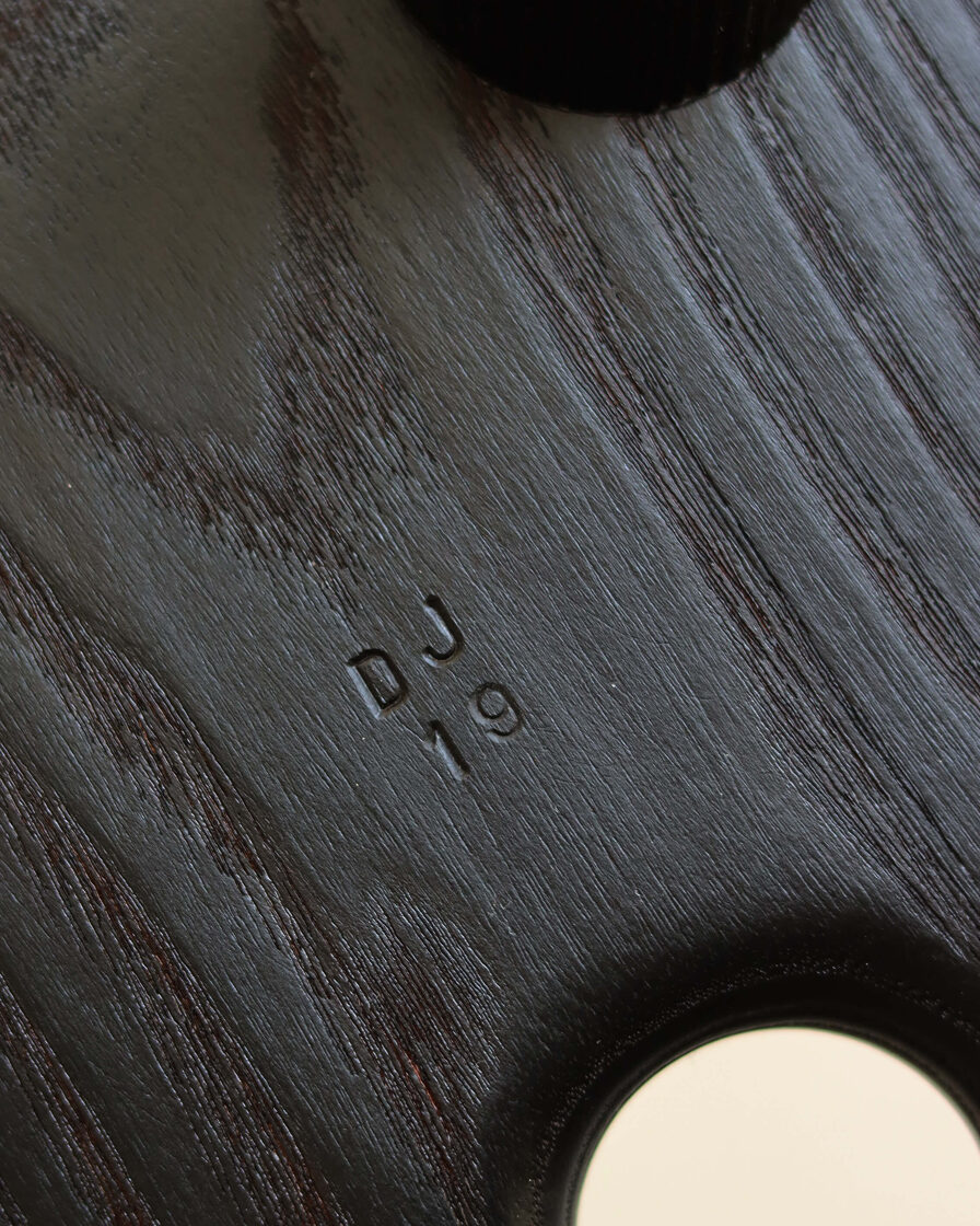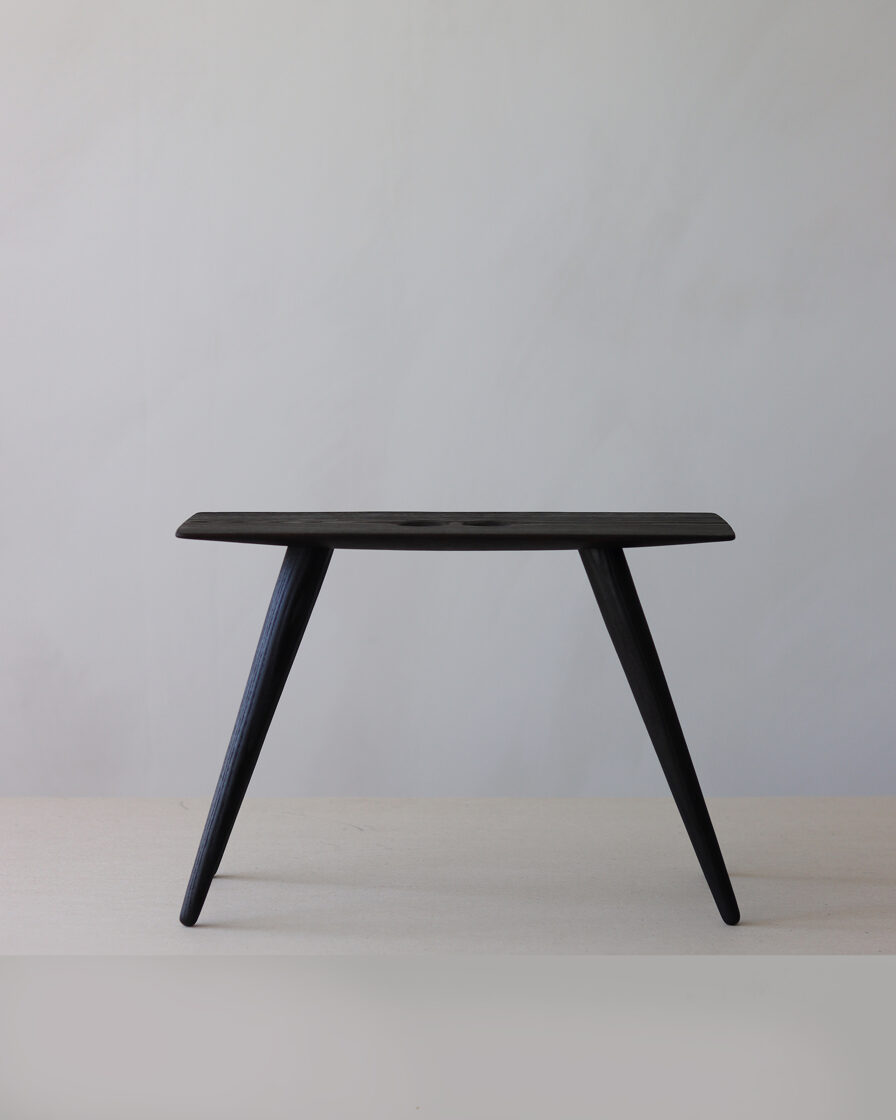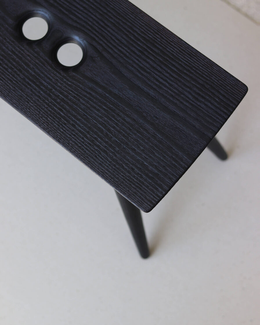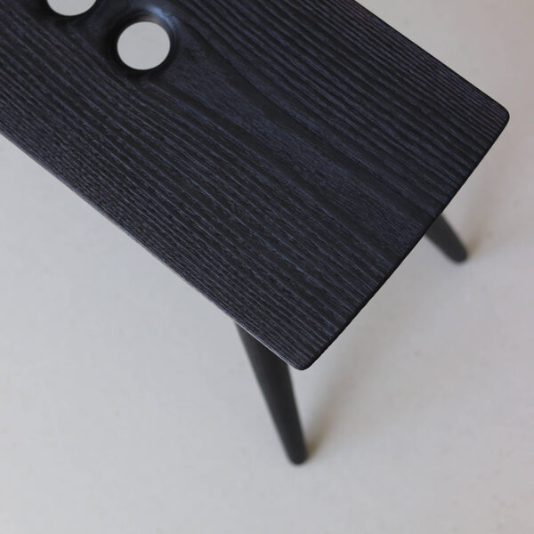Minimalist solid-wood stool features a deep, almost-black burnt-ash finish created using the traditional yakisugi wood-burning technique. Two handle holes make the stool easy to move and carry.