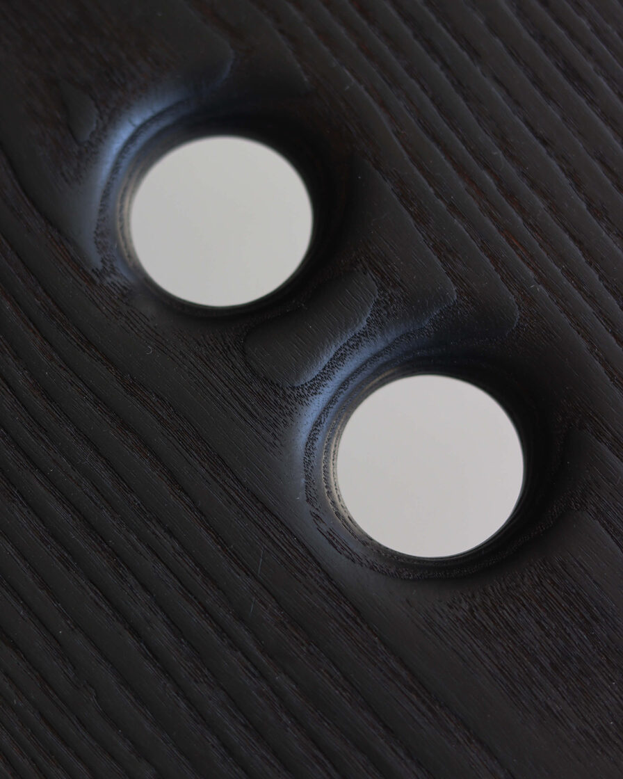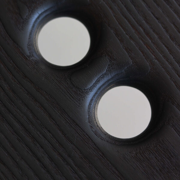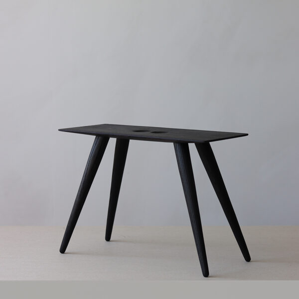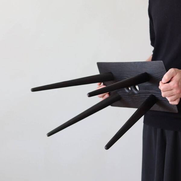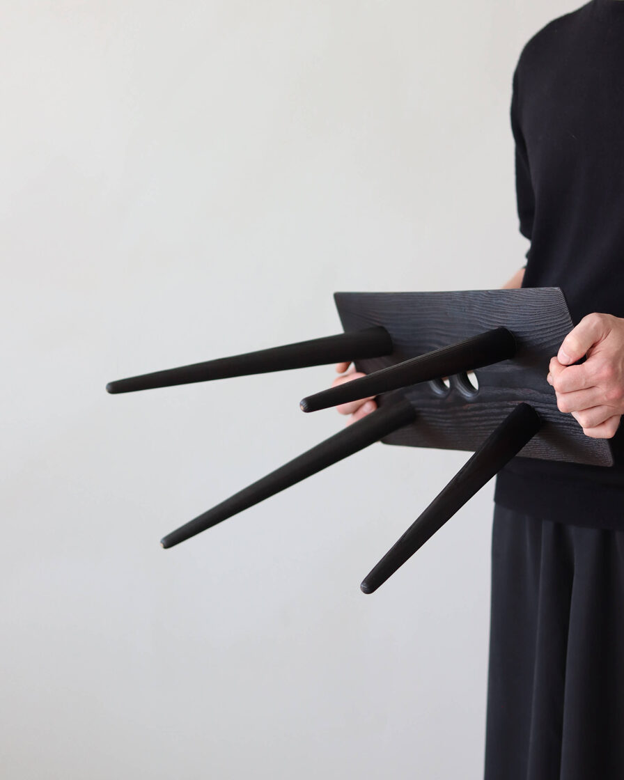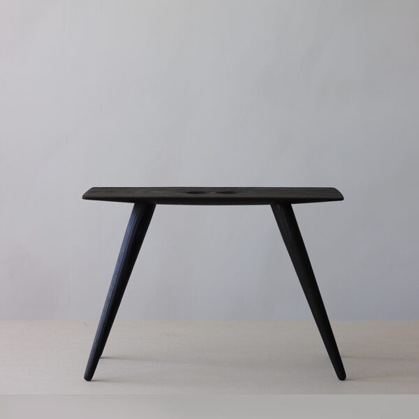 Minimalist solid-wood stool features a deep, almost-black burnt-ash finish created using the traditional yakisugi wood-burning technique. Two handle holes make the stool easy to move and carry.